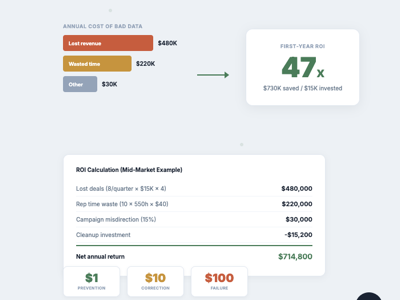 How to calculate the ROI of CRM data cleanup: cost of bad data formula, the 1-10-100 rule, worked examples, and how to present the business case to leadership.