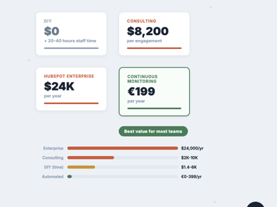 HubSpot gates portal health insights behind Enterprise ($24K/year). Get deeper diagnostics and AI readiness scoring for a fraction of the cost.
