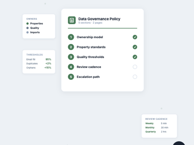 How to build a HubSpot data governance policy that sticks: ownership model, property rules, quality standards, review cadence, and enforcement through system design.