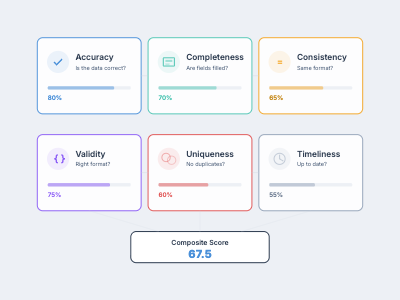 The 6 data quality dimensions — accuracy, completeness, consistency, validity, uniqueness, timeliness — and how to measure each in HubSpot.