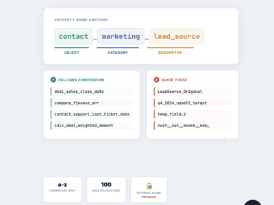 A HubSpot property naming convention framework: object_category_descriptor format, prefix rules, real examples, and how to fix badly named properties.