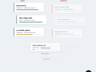 Step-by-step guide to finding unused HubSpot properties — zombie fields, low-fill properties, and orphan fields — and safely removing them without breaking workflows, reports, or integrations.