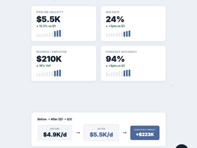 Five metrics that prove RevOps ROI to leadership: pipeline velocity, win rate, revenue per employee, time-to-revenue, and forecast accuracy.